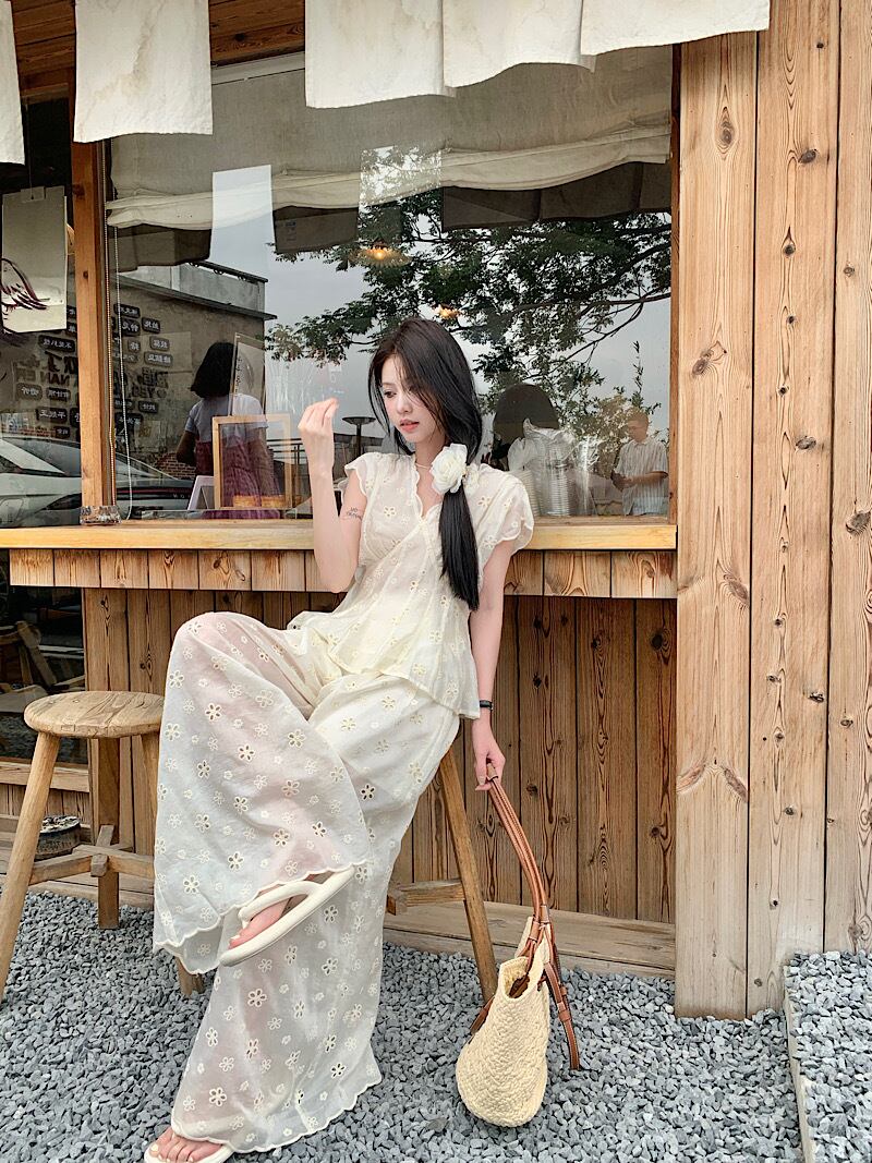海外ガール セットアップ ワンピース お洒落 花柄 お出掛け 無地 透かし