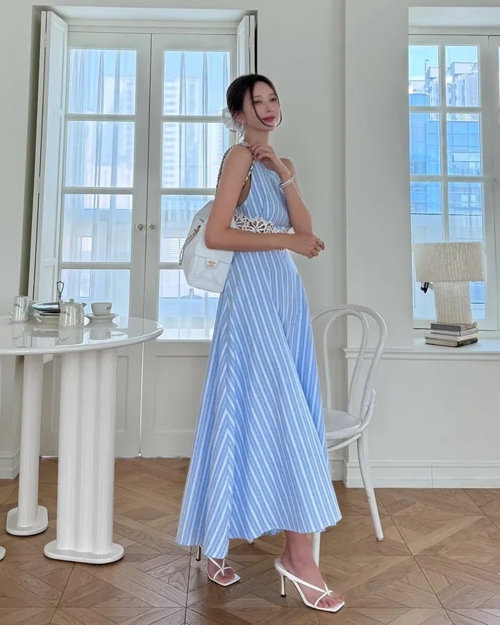 海外ガール ストライプ お洒落 ロングスカートワンピース お出掛け 編み上げ ワンピース