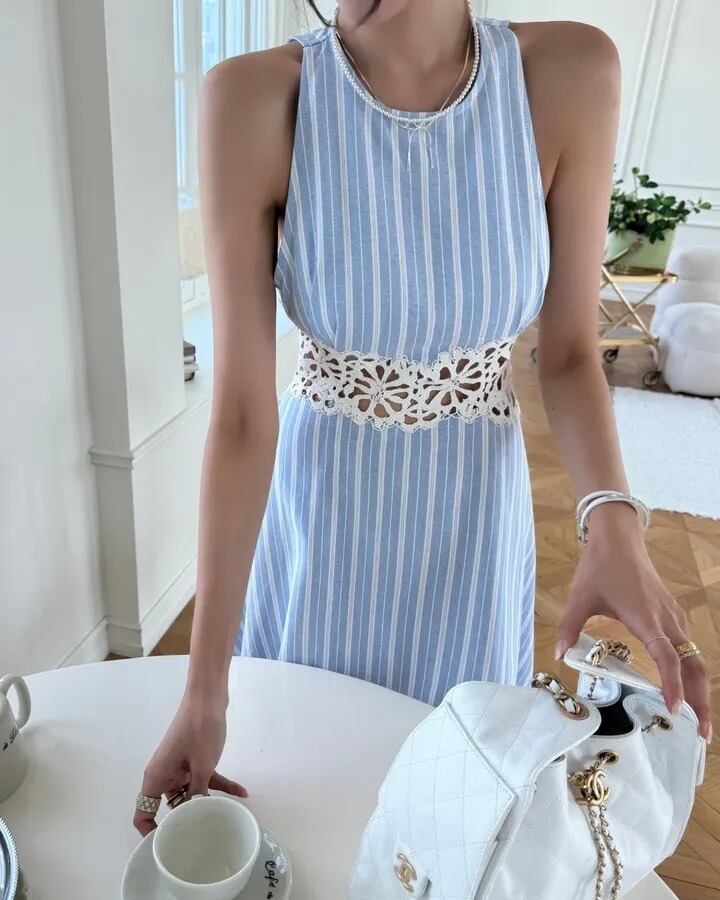 カジュアルで強気な✤ バックオープンストライプ編みレースワンピース 全1色