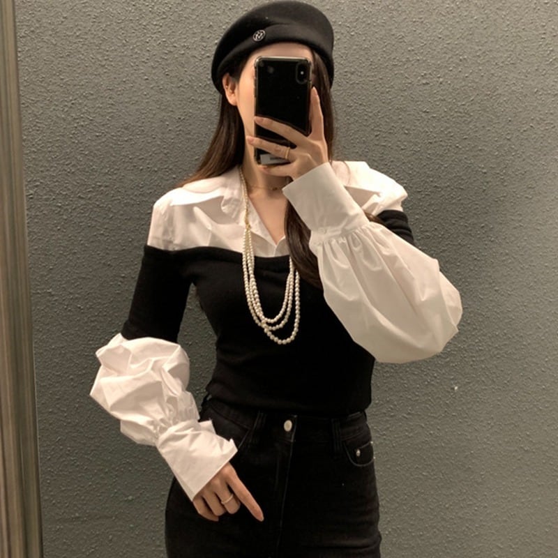 映画に出てくるようなモードシック✤ オフショルコンビシャツ 全1色