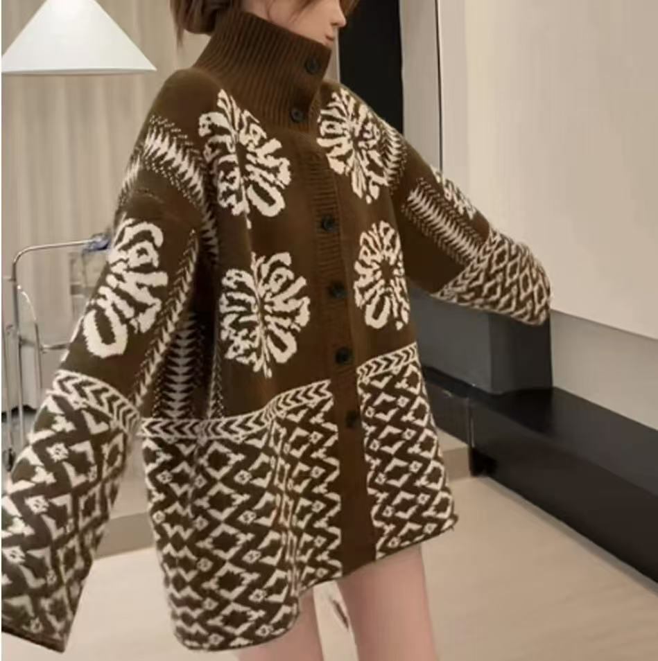 【トレンドお洒落感】柄ハイネックカーディガン