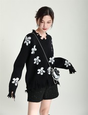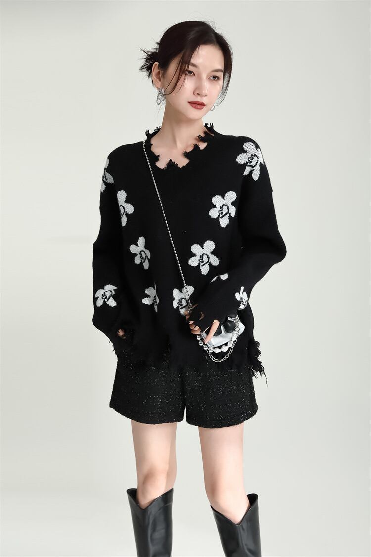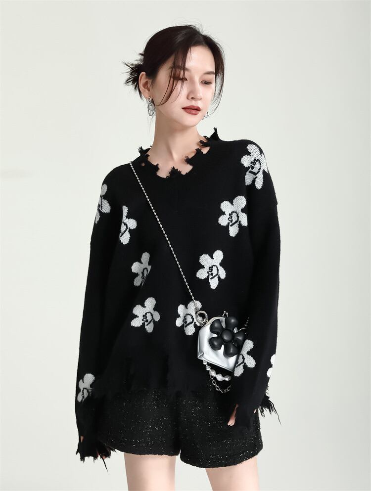 海外ガー,ニット,お花,デート,お出掛け,トレンド,ダメージ,トップス